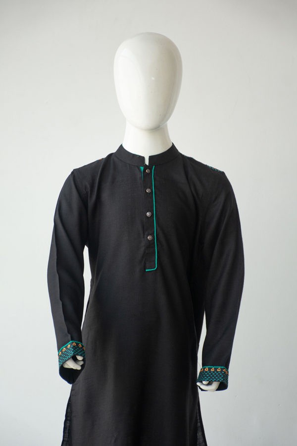 Black Cotton Printed & Hand Embroidered Panjabi for Boys