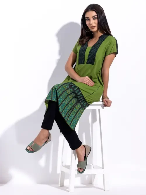 Green Printed and Embroidered Viscose-Cotton Taaga Casual Dress