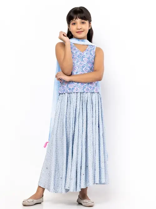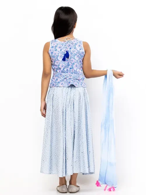 Sky Blue Printed and Embroidered Linen Ghagra Choli